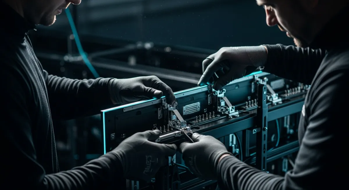 Precision-machined die-cast aluminum cabinets lock together with zero visible seams, scaling to any dimension.